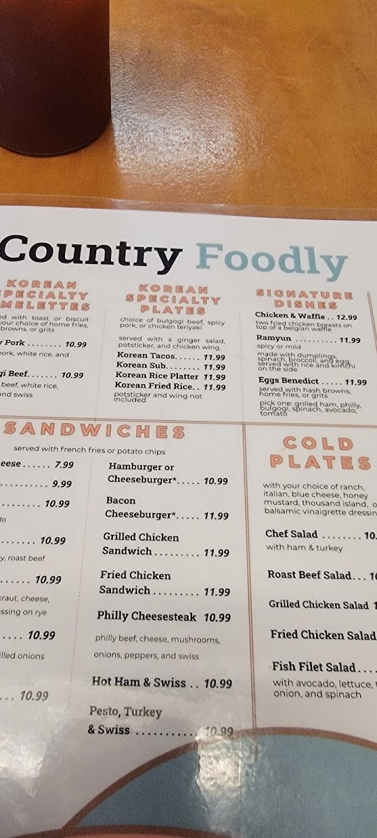 Welcome to Country Foodly, a charming restaurant nestled at 5240 NW 34th Blvd, Gainesville, FL. This delightful eatery marries traditional breakfast favorites with an adventurous twist, featuring an enticing menu that ranges from classic American breakfast sandwiches to unique Korean-inspired omelettes.